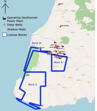 1TTG的地?zé)衢_發(fā)準(zhǔn)證,其中藍(lán)色邊界線內(nèi)為準(zhǔn)證覆蓋區(qū)域(E區(qū)塊Transmark GPP項目所在地)。